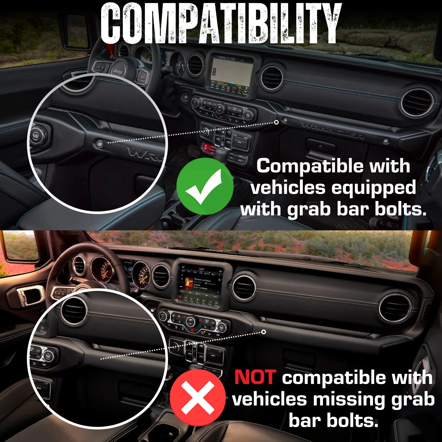 If your Jeep is equipped with a leather-wrapped grab handle without the exposed bolts, we have a solution for you: Passenger Grab Bar Mount compatible with 2018-2023 Jeep Wrangler JL & 2020-2023 Jeep Gladiator